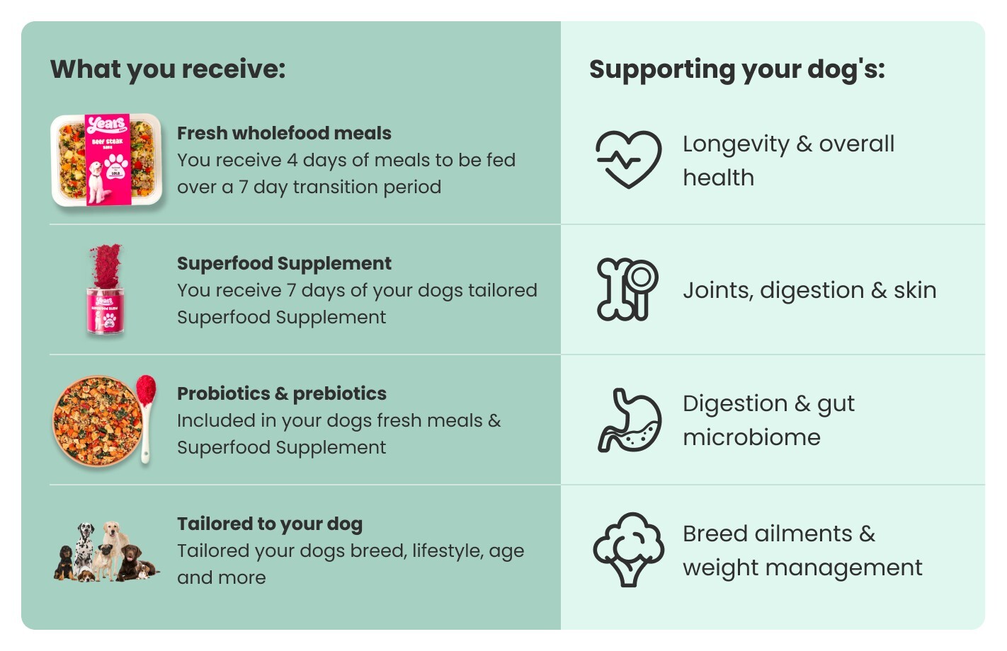 Years offer completely customised meal plans for customers who prefer to order their dog's food online with delivery, with personalised ingredients based on your dog's breed, life-stage and activity level.